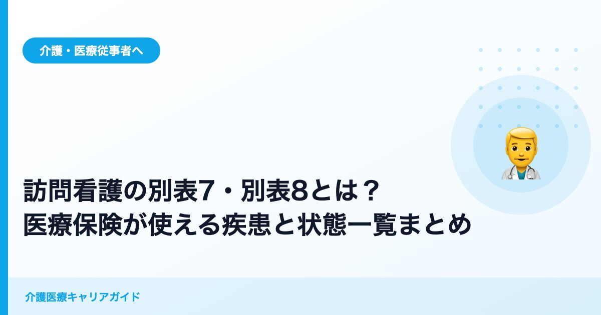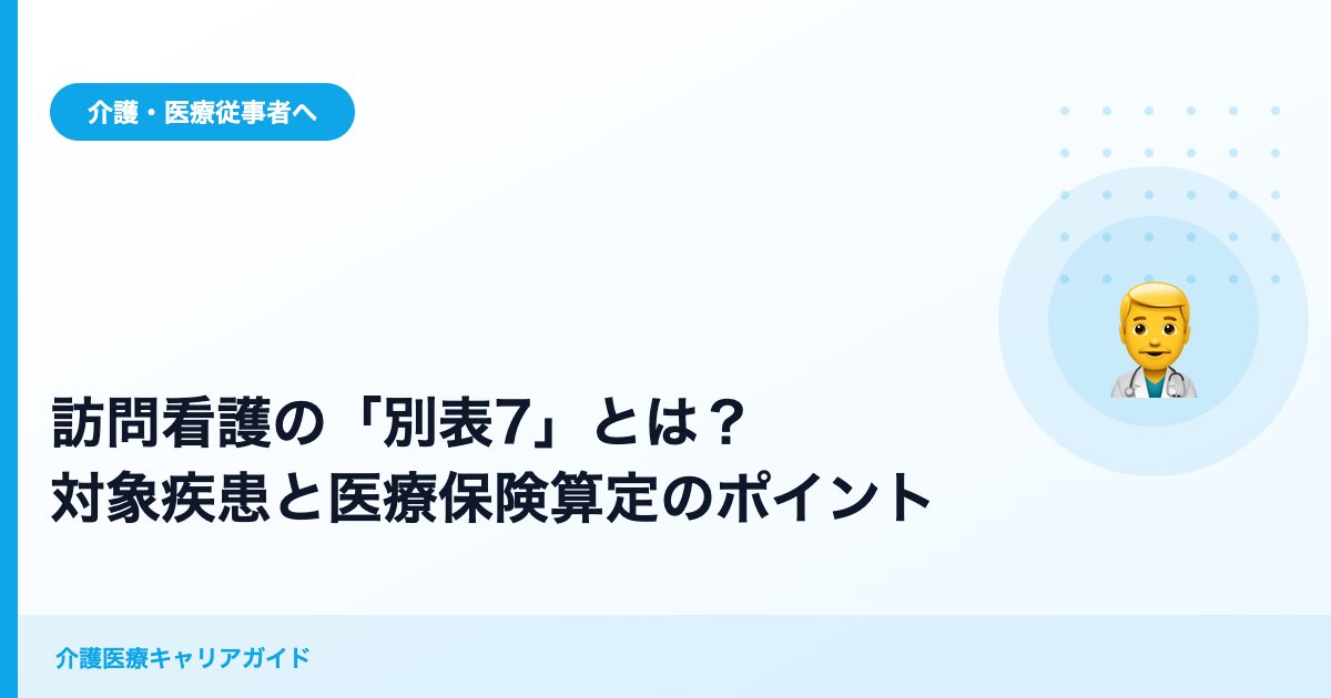 訪問看護の「別表7」とは、医療保険での算定が認められる19疾患・状態の一覧です。介護認定を受けていても医療保険が優先される仕組みや、対象疾患一覧(印刷用)、パーキンソン病の適用条件、算定の手順、よくある質問をわかりやすく解説します。 -