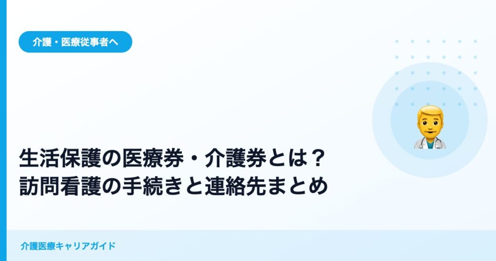 訪問看護ステーションで生活保護の方を担当するとき、「医療券って何?」「介護券はどう扱えばいい?」と戸惑う場面は少なくありません。この記事では、現場経験のある作業療法士・介護福祉士の視点から、医療券・介護券の仕組みから実務手続きまで丁寧に... -