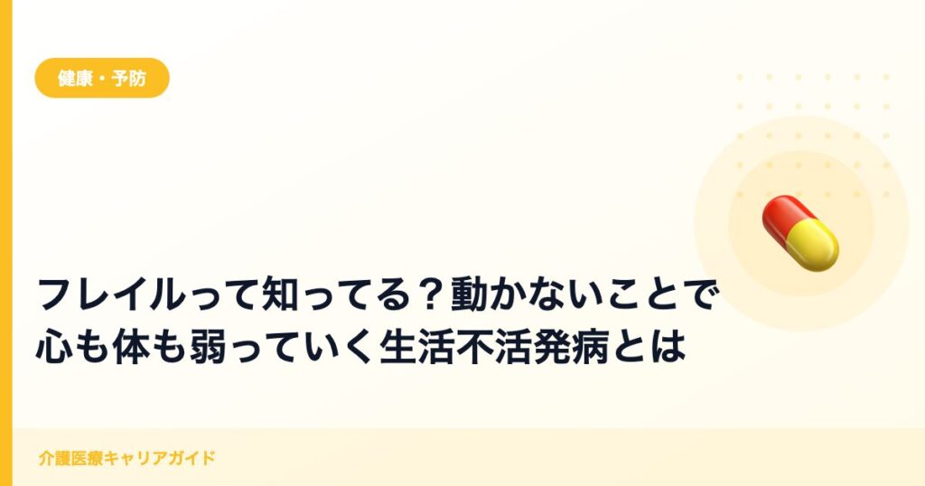 🏡 フレイルとは?簡単に知っておこう フレイルとは、加齢によって心身の活力が低下し、要介護の一歩手前の状態を指します。 ✅ 筋力が落ちて疲れやすくなる✅ 食事量が減って体重が減る✅ 外出の機会が減る このような変化が重なると、転倒や寝たきりにな... -